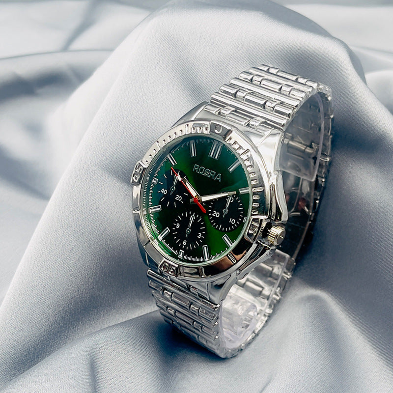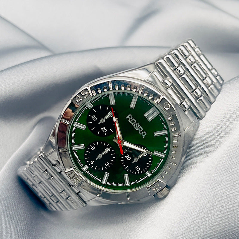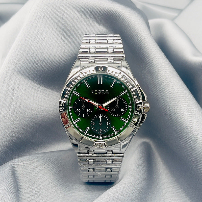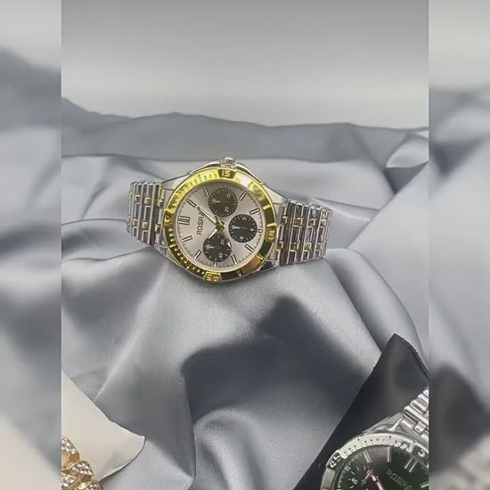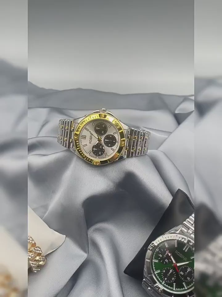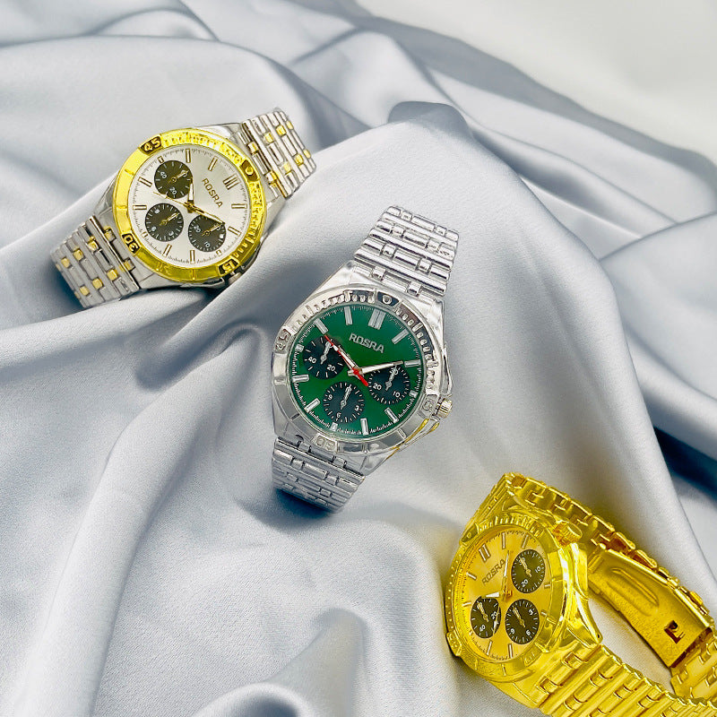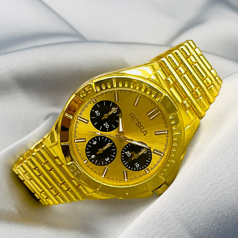 This men’s quartz watch features a bold 45mm round dial combined with a gold-toned stainless steel case and bracelet. The decorative three sub-dial design adds depth and luxury style, making it ideal for business, parties, and daily wear.